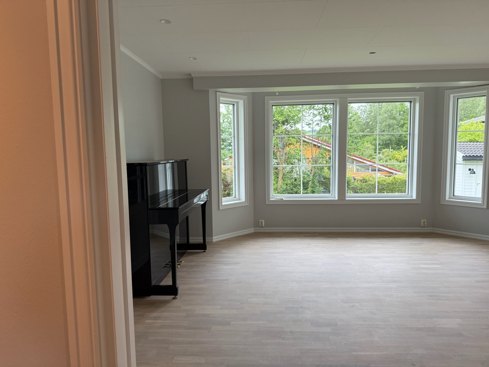 Romslig stue i enebolig malt i en lys, nøytral grå tone. De store vinduene slipper inn rikelig med dagslys, og den lyse fargepaletten gir rommet en frisk og moderne fremtoning. Prosjektet inkluderte maling av vegger, tak og listverk.