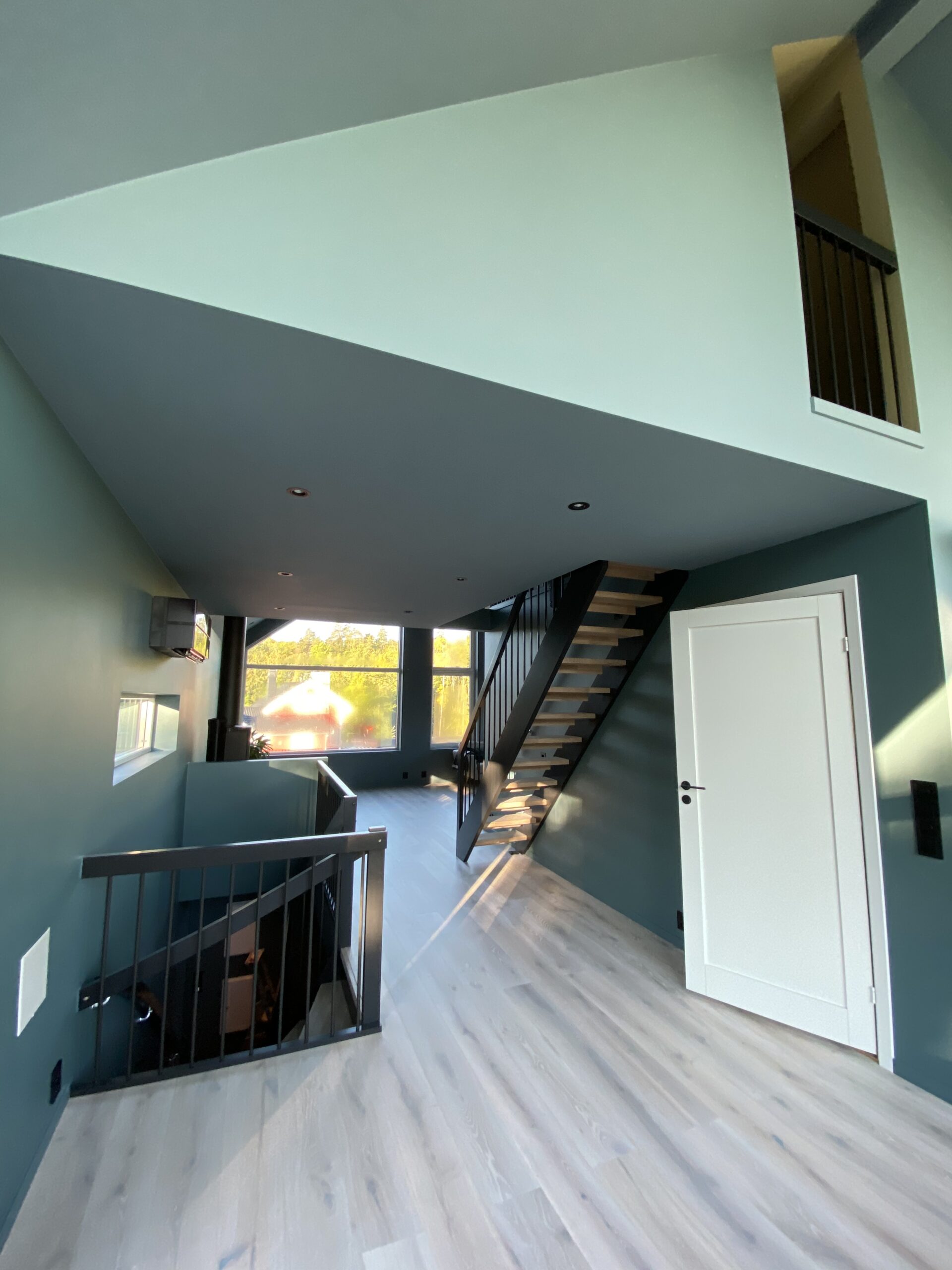 Komplett sparkling og maling av nybygg. Veggene ble sparklet til en jevn og glatt overflate og malt i en moderne blågrønn/teal tone. Den flytende trappen i lys eik og de store vindusflatene gir det nye hjemmet et luftig og innbydende preg fra første dag.